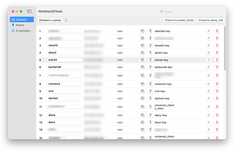 Так же появились кнопки, которые явным образом позволяют выполнить необходимые действия – скопировать ключ, скопировать команду для подключения к серверу, отредактировать запись сервера и удалить его.