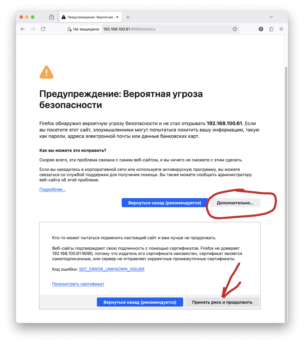 Поскольку подключение происходит посредством https и используется самоподписанный сертификат, вам придется подтвердить исключение в своем браузере.