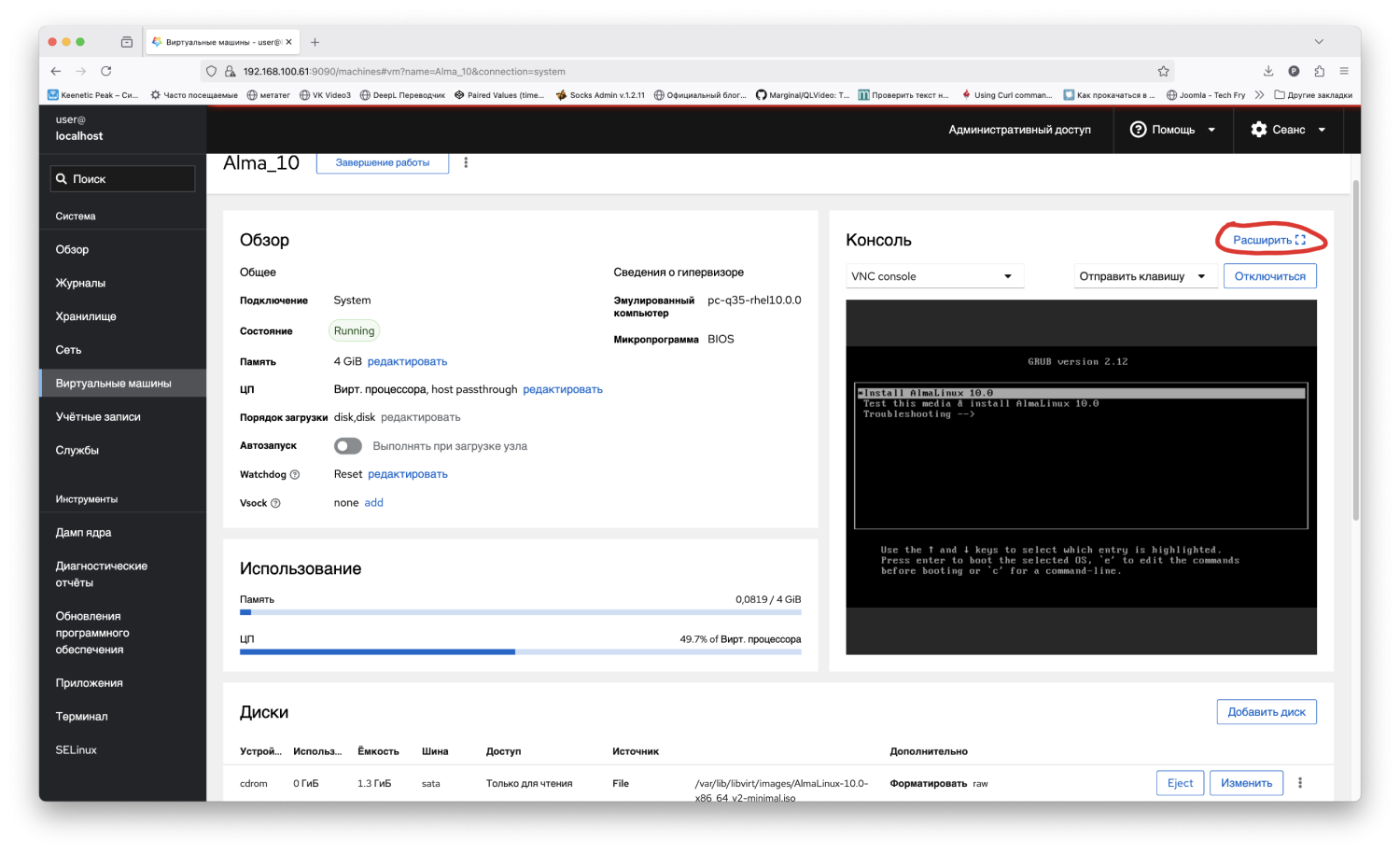 Можно выбрать и тип установки «Загрузить ОС», но тогда дистрибутив будет выбирать уже сам cockpit и подгружать его онлайн. Это может быть не очень удобно для всех (хотя кому это может оказаться наоборот значительно удобнее, чем искать по сайтам где скачать дистрибутив). Например, для AlmaLinux 10 это может привести к неработоспособному состоянию на старых компьютерах, которые не поддерживают систему команд x86_64_v3. Поэтому советую начинать с уже загруженного дистрибутива и типа установки «Local install». Потом уже вы сможете самостоятельно выбирать тип установки.