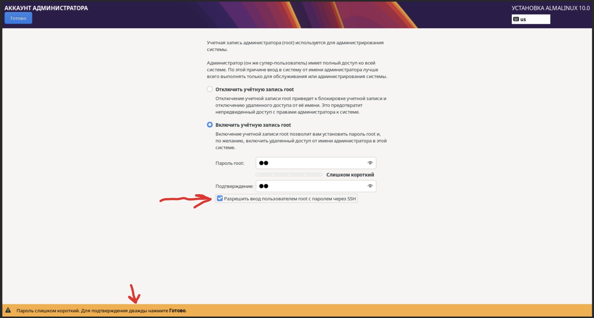 На данном этапе советую сильно не усердствовать с паролем — потом его можно поменять или отключить в пользу использования SSH ключей.
