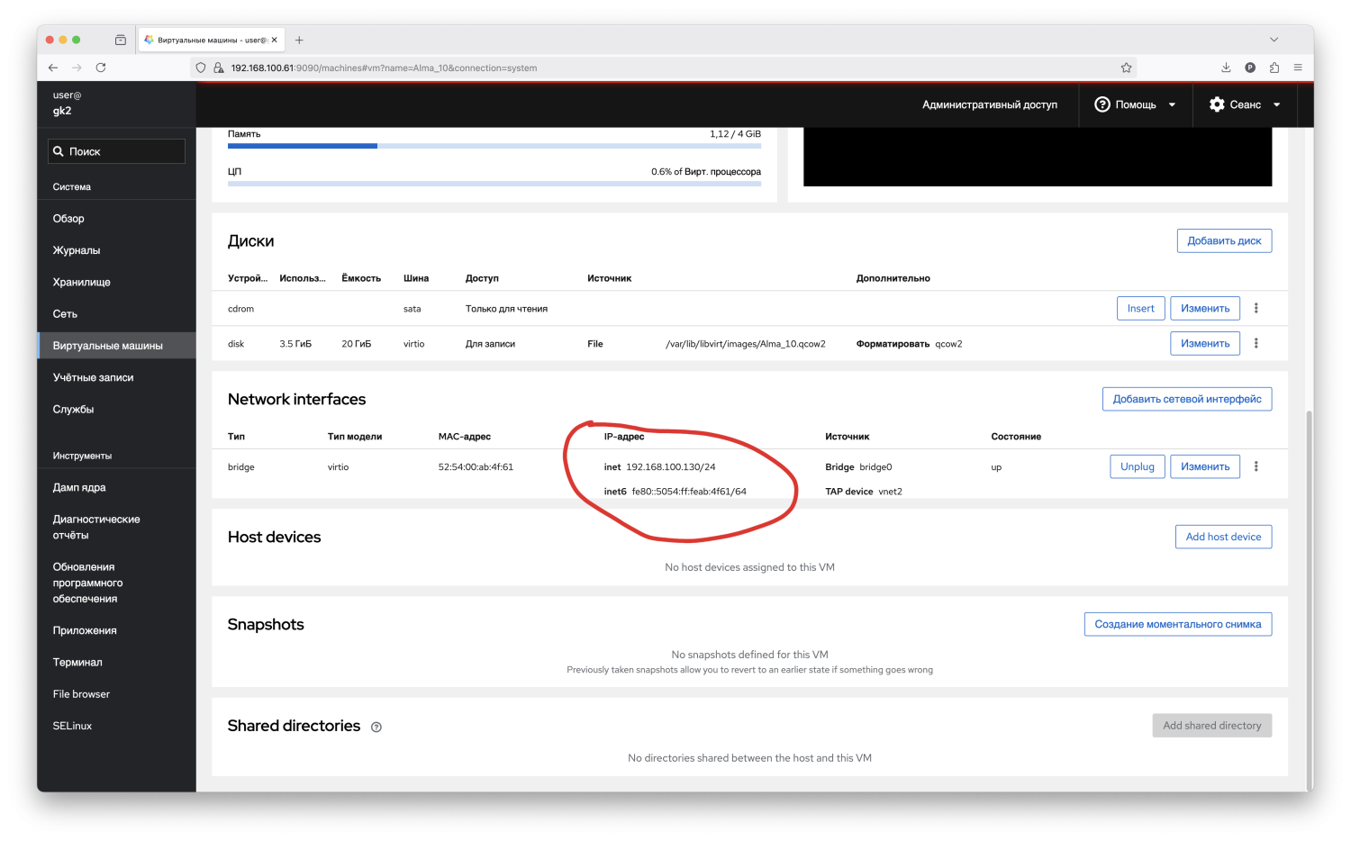 Признаком корректной работы агента будет появление IP адреса машины в интерфейсе cockpit.