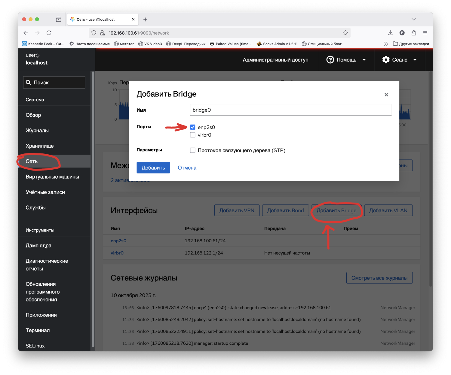 Для этого перейдите в раздел «Сеть», нажмите кнопку «Добавить Bridge» и выберите вашу сетевую карту. Скорее всего она там будет одна — enp2s0 или что-то подобное. Virbr0 — это виртуальная карта NAT, которую создает KVM при установке — ее выбирать не надо. Не забываем нажимать кнопку «Добавить».