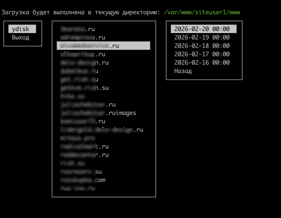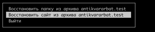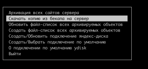 Чтобы скачать копию из бэкапа нужно выбрать пункт меню Скачать копию из бекапа на сервер