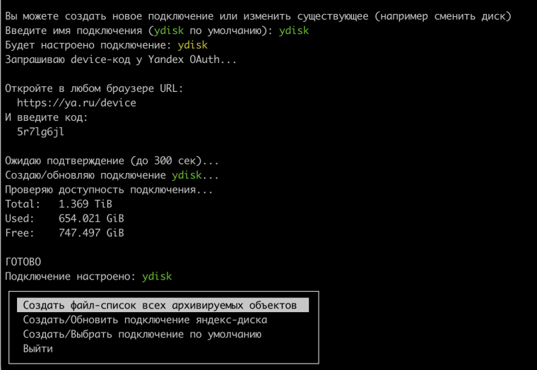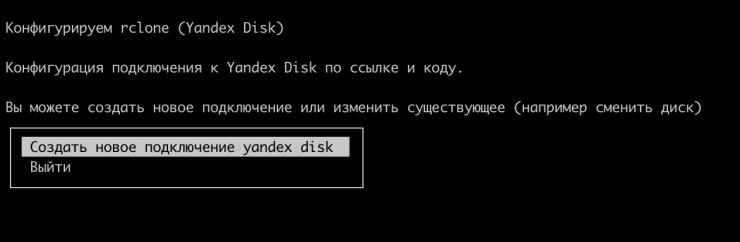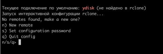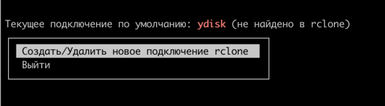 После выбора единственного пункта меню будет вызвана соответствующая команда rclone для создания или редактирования новых подключений (remote).