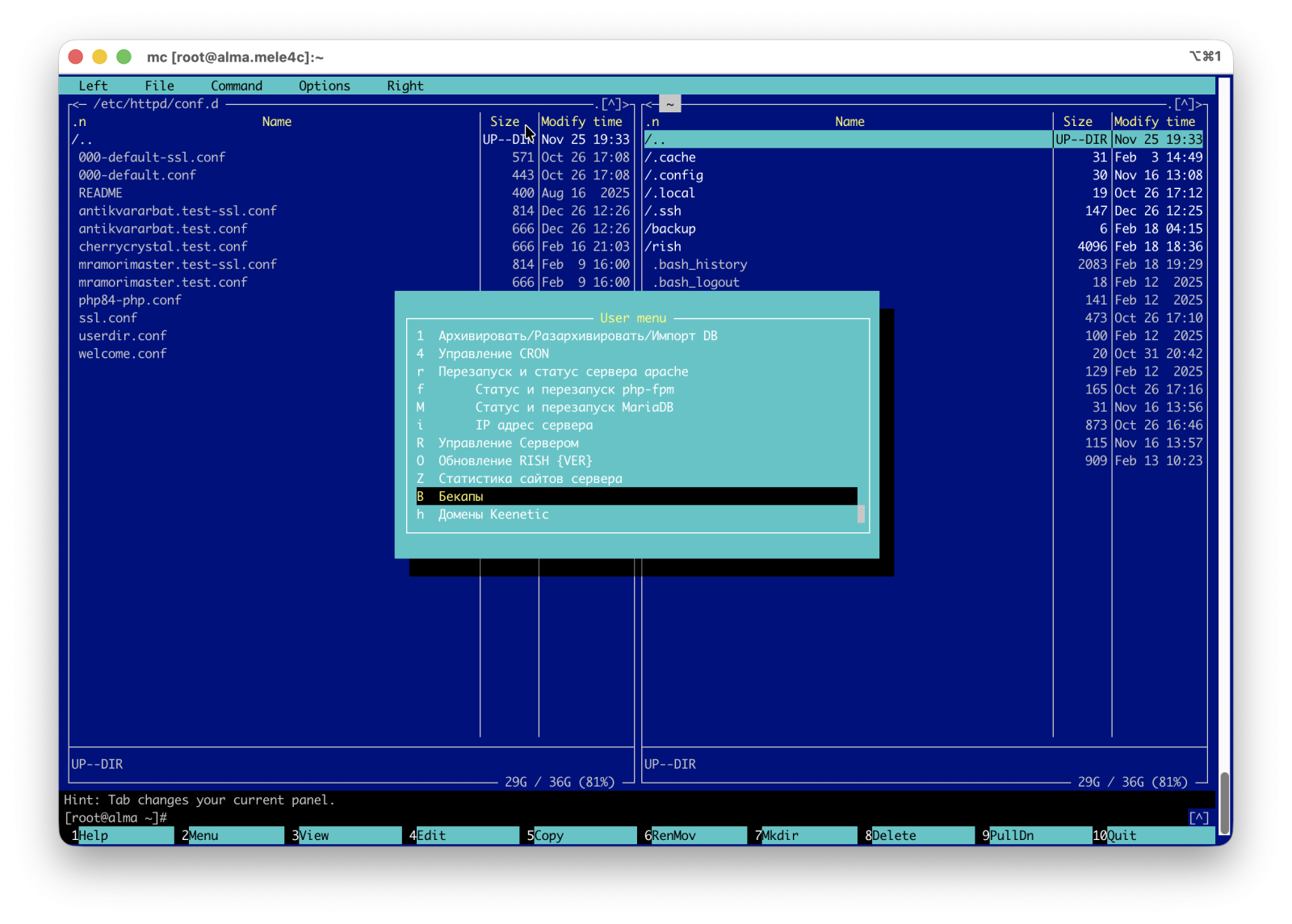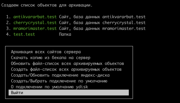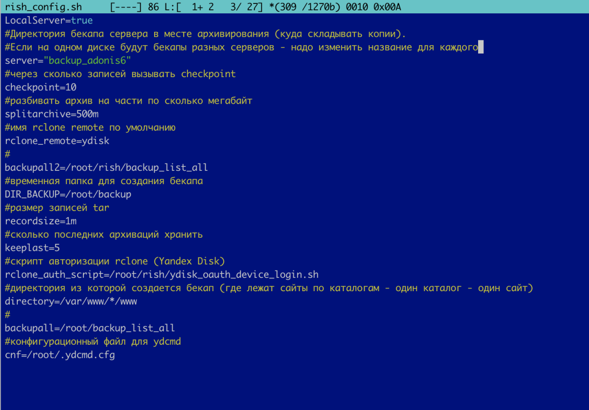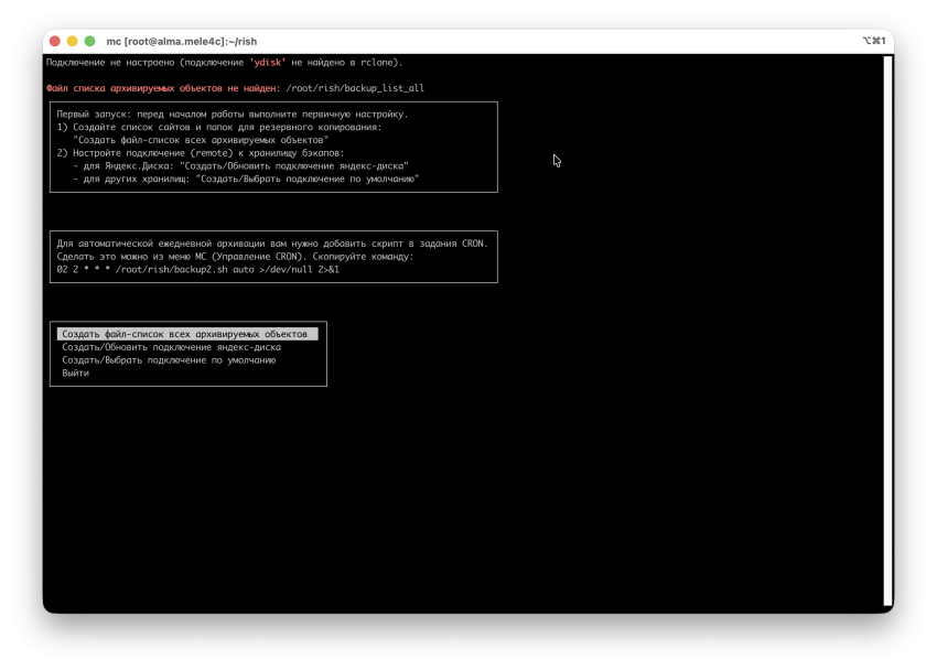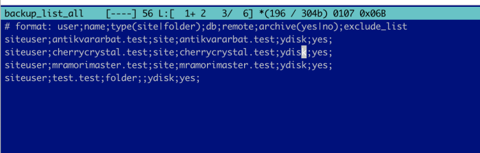 Файл-список объектов, которые подлежат резервному копированию, находится по адресу /root/rish/backup_list_all. Вы можете свободно редактировать его — это обычный текстовый файл, который имеет достаточно простой и понятный формат.