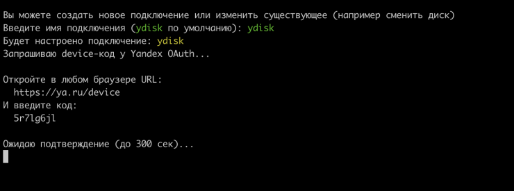 После того, как вы зададите имя диска вам будет предложено открыть ссылку https://ya.ru/device в вашем браузере, где есть авторизация Яндекс.
