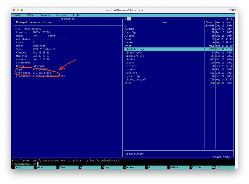 F10 – выйти из MC. Не забывайте это сделать, если у вас включен режим Ctrl-o. После выхода из MC можно закрыть окно подключения по SSH с помощью Ctrl-D.